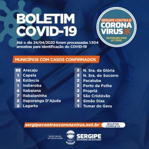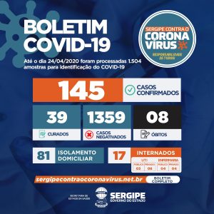 A Secretaria de Estado da Saúde divulgou nesta sexta-feira, 24, o novo boletim epidemiológico do coronavírus (Covid-19), que aponta mais 10 casos da doença em Sergipe, sendo nove em Aracaju e um em Nossa Senhora do Socorro. O Estado passa a ter 145 casos confirmados.
