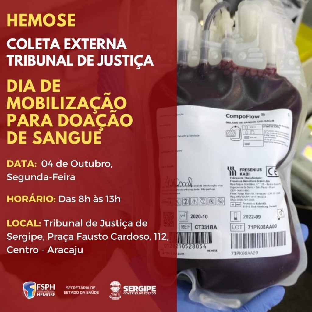 O Centro de Hemoterapia de Sergipe (Hemose) realiza na próxima segunda-feira, 4, no horário das 8h às 13h, uma coleta externa de sangue na sede do Tribunal de Justiça de Sergipe (TJSE) localizado na Praça Fauto Cardoso, em Aracaju.