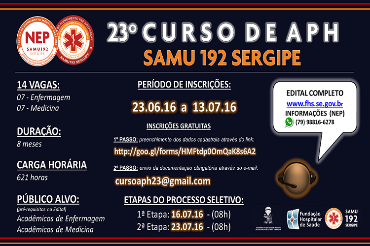 Por Júnior Matos O Serviço de Atendimento Móvel de Urgência (Samu 192 Sergipe) abriu hoje ,23, as inscrições para o 23º Curso de Atendimento Pré-Hospitalar (APH). O curso é gratuito […]