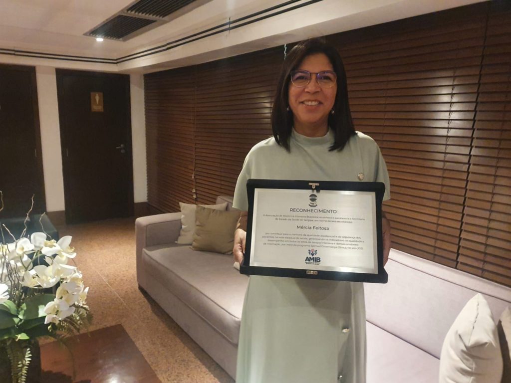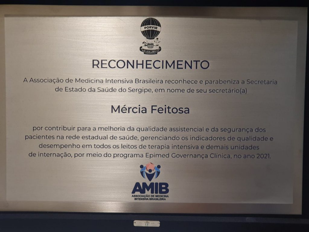 A Secretaria de Saúde de Sergipe foi reconhecida e homenageada nacionalmente por contribuir para a melhoria da qualidade assistencial e da segurança dos pacientes na rede estadual de saúde. A secretária Mércia Feitosa recebeu, na noite da última quarta-feira, em Brasília, a placa de reconhecimento ofertada pela Associação de Medicina Intensivista Brasileira (AMIB) devido ao gerenciamento dos indicadores de qualidade e desempenho em todos os leitos de terapia intensiva e demais unidades de internação, por meio do programa Epimed Governança Clínica no ano de 2021.