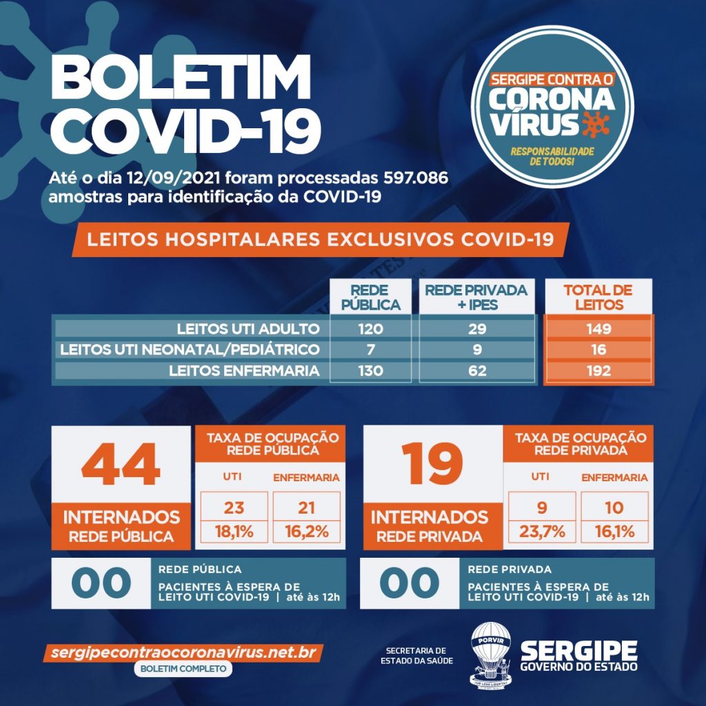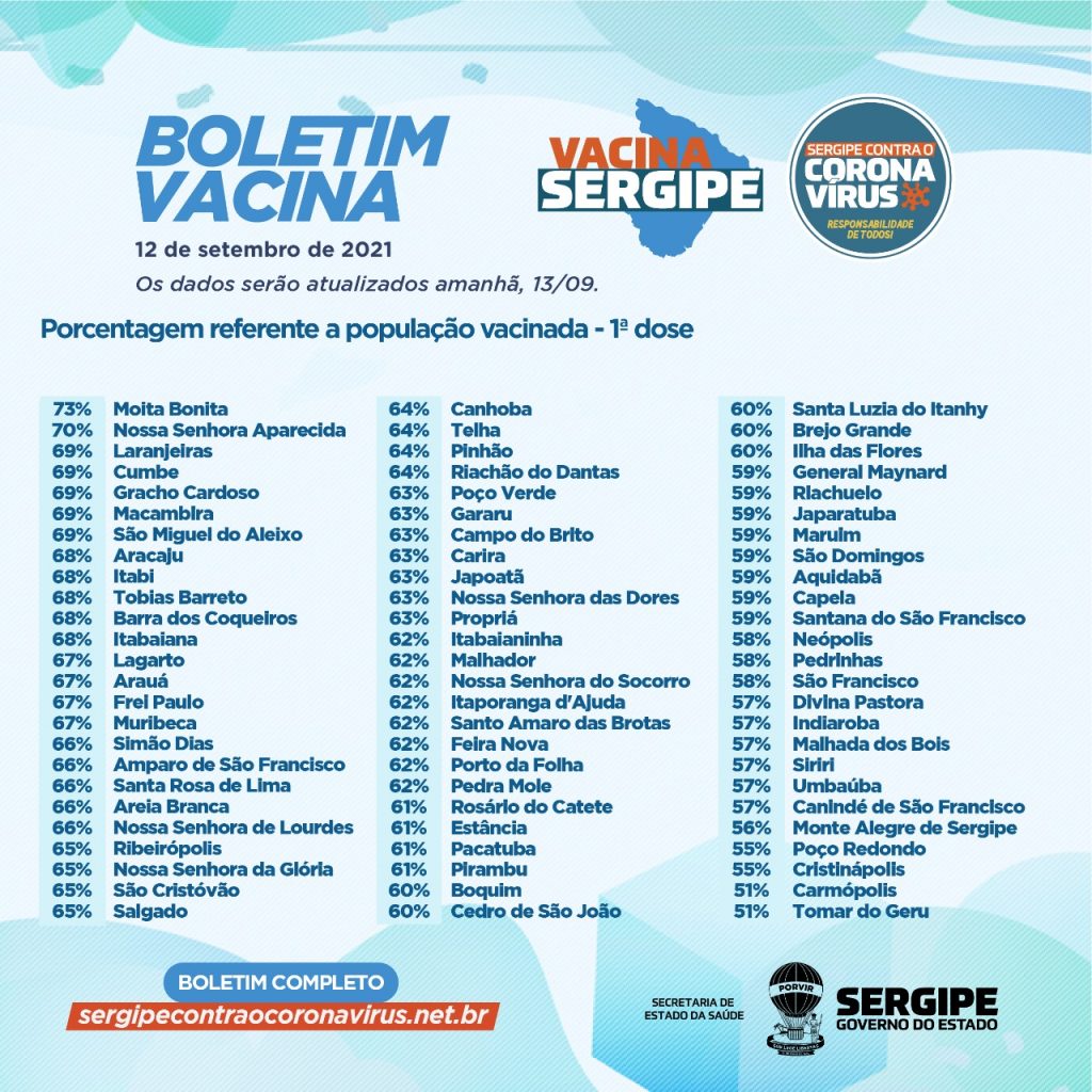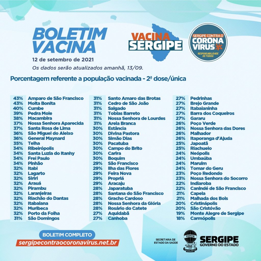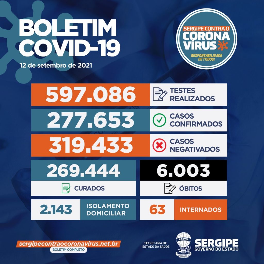 Secretaria de Estado da Saúde (SES), divulga novo boletim epidemiológico no último domingo, 12, nele o estado continua sem registros de óbitos pela Covid-19 nas últimas horas. Sendo assim, Sergipe permanece com o total de 6.003 mortes relacionadas à pandemia.