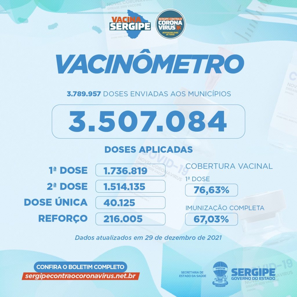 Foram enviadas aos municípios 3.789.957 doses. Destas, 1.736.819 foram aplicadas como primeira dose; 1.514.135 como segunda dose; 40.125 como dose única e 216.005 como dose de reforço. A cobertura vacinal de primeira dose está em 76,63% e 67,03% estão com a imunização completa.