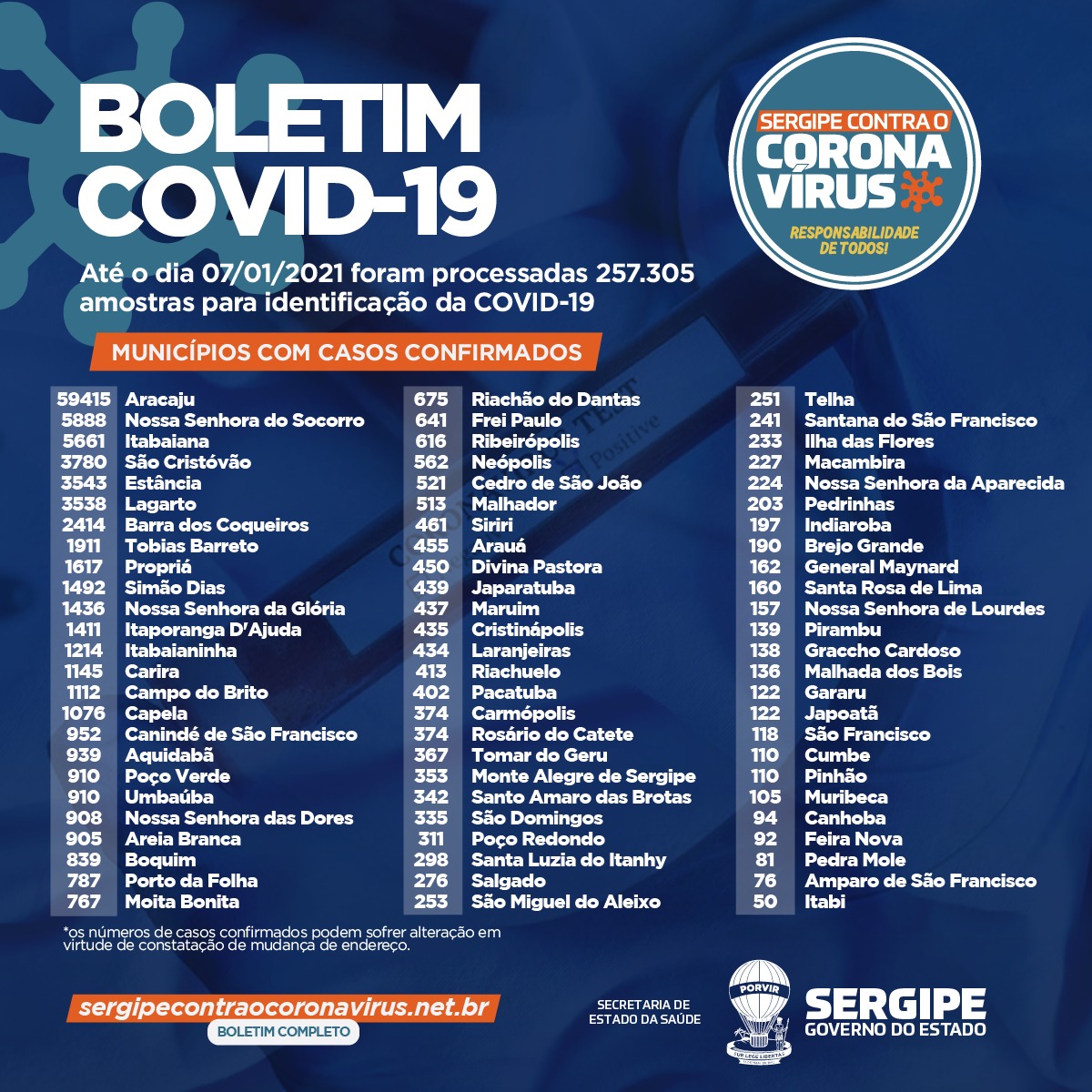 As 12 mortes foram: um homem, 53 anos, de Tobias Barreto, sem comorbidade; uma mulher, 54 anos, de Indiaroba, com diabetes e doença cardiovascular; um homem, 63 anos, de Campo do Brito, com doença cardiovascular, diabetes e doença pulmonar obstrutiva crônica; um homem, 77 anos, de Telha, sem comorbidade; uma mulher, 46 anos, de Aracaju, sem comorbidade; um homem, 55 anos, Aracaju, com Imunodeficiência – portador do virus HIV; um homem, 34 anos, de Aracaju, sem comorbidade; uma mulher, 75 anos, Areia Branca, sem comorbidade; um homem, 62 anos, de Neópolis, sem comorbidade; um homem, 92 anos, de Nossa Senhora do Socorro, com hipertensão; uma mulher,83 anos, de Itabaiana, com hipertensão; um homem, 55 anos, Nossa Senhora do Socorro, hipertensão e diabetes.