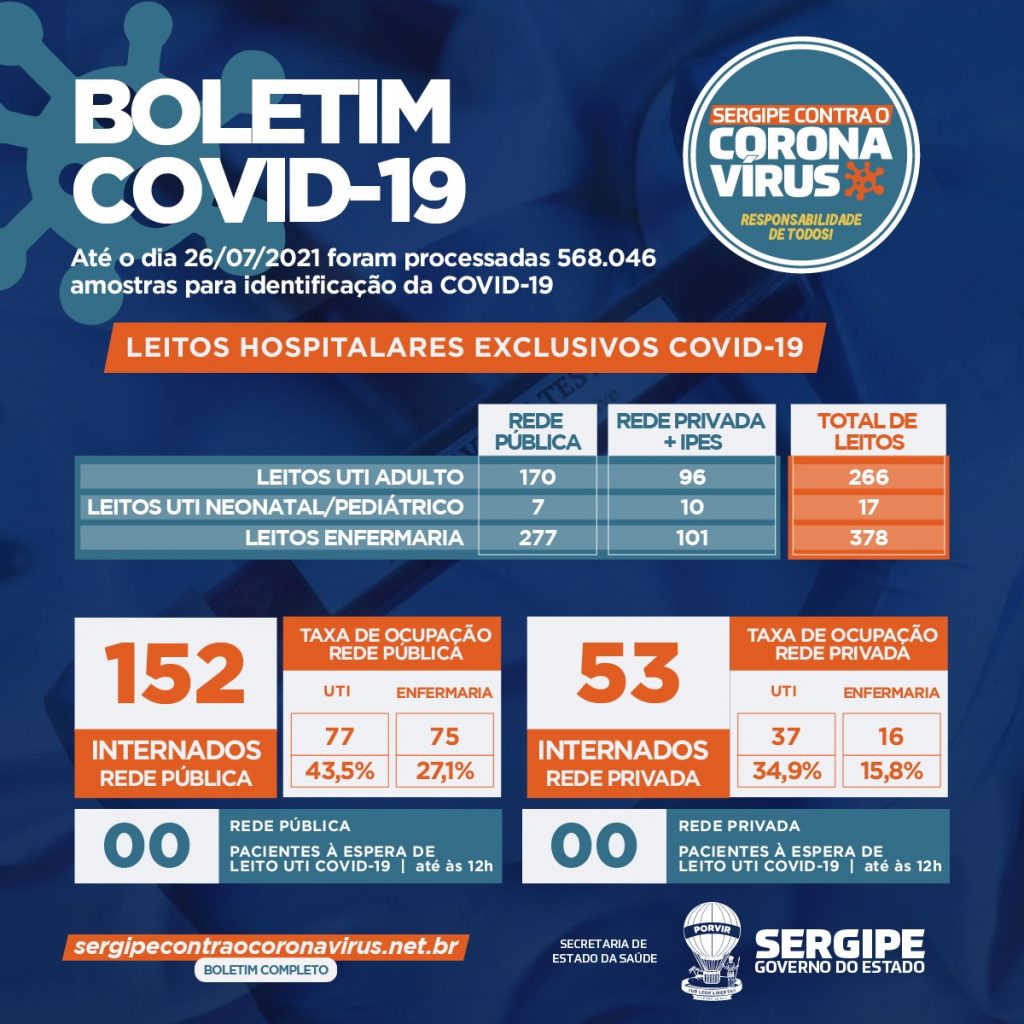 Foram realizados 568.046 exames e 294.716 foram negativados. Estão internados 205 pacientes, sendo que no serviço público são 76 em leitos de UTI (adulto), um na UTI neonatal/ pediatria e 75 em leitos clínicos (enfermaria), totalizando 152. Já nos leitos do serviço privado estão internados 37 pessoas na UTI adulta, zero na UTI neonatal/ pediatria e 16 em leitos clínicos, totalizando 53. Mais quatro óbitos estão em investigação. Ainda aguardam resultados 292 exames coletados.