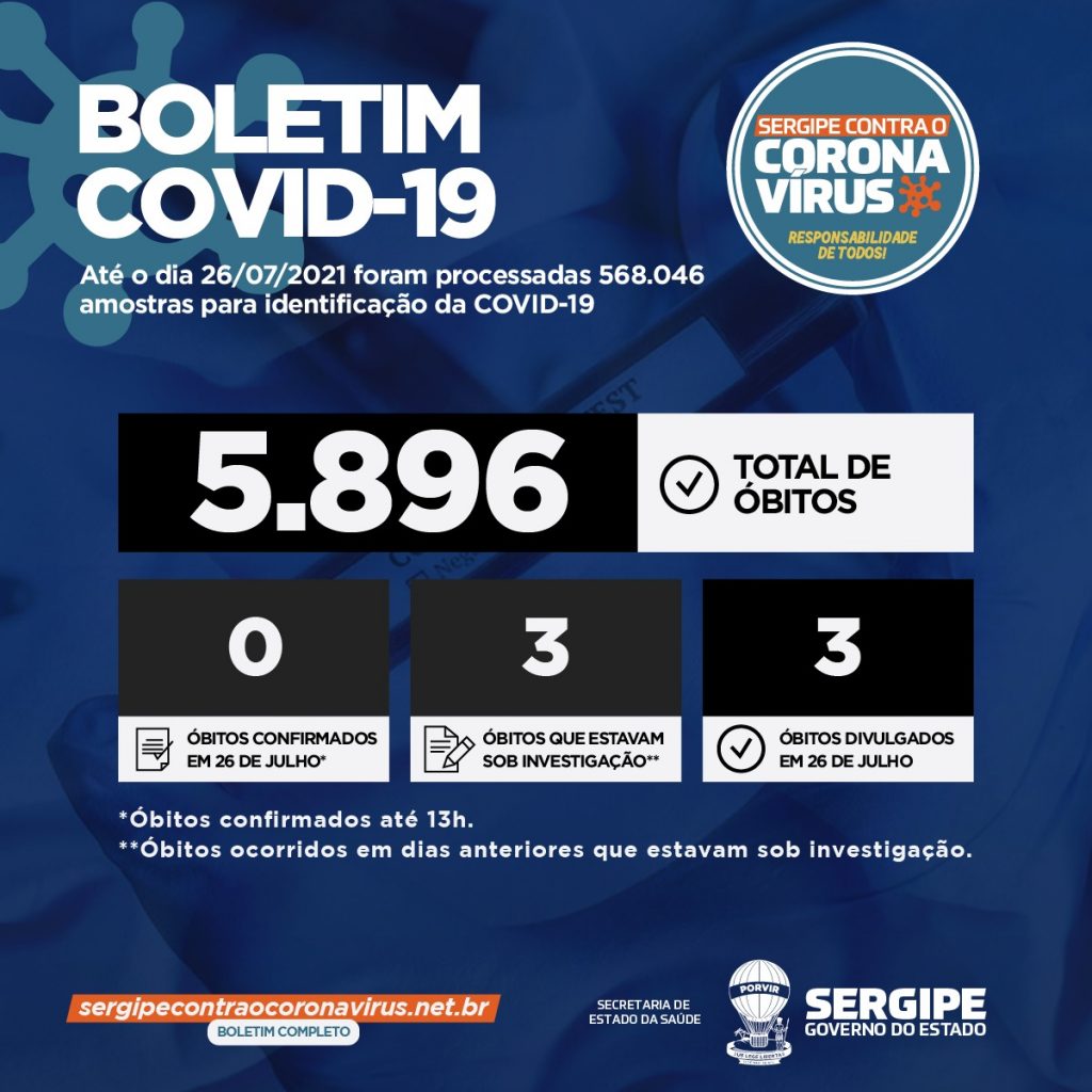 A Secretaria de Estado da Saúde (SES) divulga nesta segunda, 26, o boletim epidemiológico do coronavírus com 282 casos e três óbitos que estavam em investigação e foram confirmados. Em Sergipe, 273.330 pessoas já testaram positivo para a Covid-19 e 5.896 morreram. Até o momento, 262.944 pacientes foram curados.