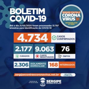 A Secretaria de Estado da Saúde divulgou nesta quinta-feira, 21, o boletim epidemiológo do novo coronavírus (Covid-19) com 458 novos casos da doença. Sergipe passa a ter 4.734 pessoas infectadas. Foram registrados mais sete óbitos, sendo quatro homens, duas mulheres e uma criança de oito meses. Estão em investigação 24 óbitos.
