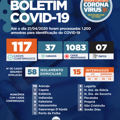 Simão Dias registrou mais três casos: uma idosa de 90 anos e dois homens (43 e 55 anos). Este último hospitalizado. Itabaianinha e Lagarto tem um caso novo cada: ambos um homem de 25 anos de idade. Foram 1083 testes negativados.