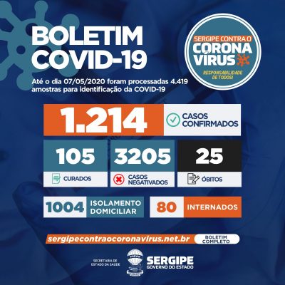 A Secretaria de Estado da Saúde registrou nesta quinta-feira, 7, mais 216 novos casos de Covid-19 em Sergipe. Com estes, sobe para 1.214 o número de casos da doença. Estão em investigação três óbitos, sendo duas mulheres, de 70 anos de Umbaúba, de 55 de Carmópolis; e um homem de 64 anos de Canindé de São Francisco.