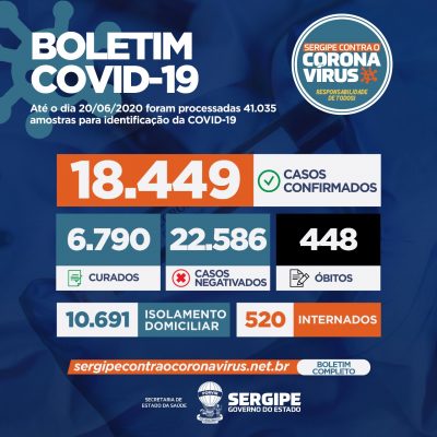 A Secretaria de Estado da Saúde (SES) divulga neste sábado, 20, o boletim epidemiológico do novo coronavírus, com 641 novos casos registrados e mais 22 óbitos. Em Sergipe, 18.449 pessoas já testaram positivo para a COVID-19 e 448 morreram. Um caso registrado em Indiaroba e dois em Itabaiana foram alterados para Aracaju.