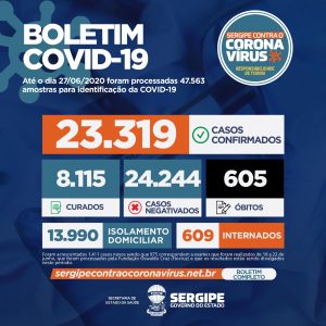 A Secretaria de Estado da Saúde (SES) divulga neste sábado, 27, o boletim epidemiológico do coronavírus, com 1.411 novos casos e 26 óbitos. Em Sergipe, 23.319 pessoas já testaram positivo para a COVID-19 e 605 morreram. Entre os novos casos, 975 correspondem a exames realizados entre 18 e 22 de junho, que foram processados pela Fundação Oswaldo Cruz (Fiocruz), no Rio de Janeiro.