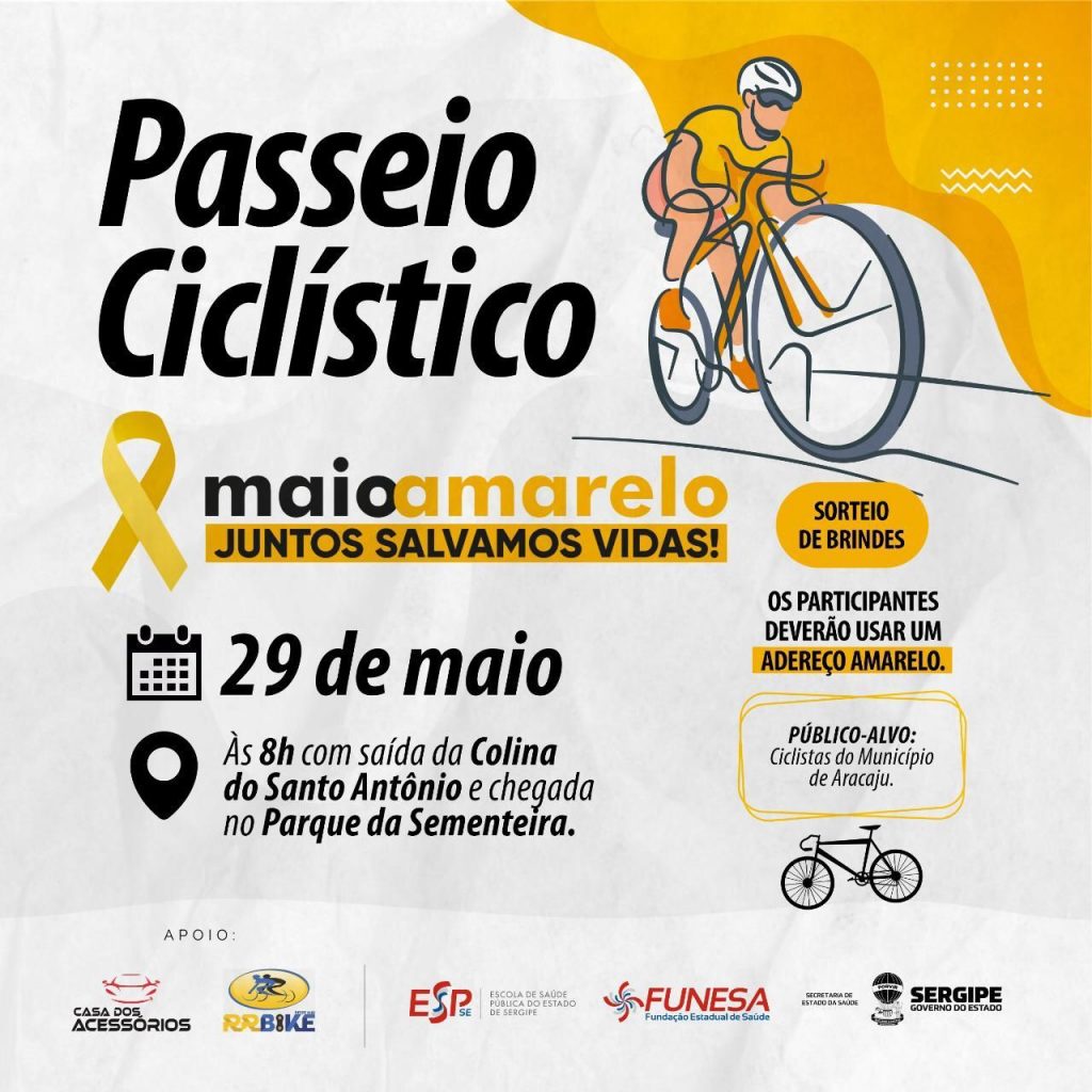 A Secretaria de Estado da Saúde, por meio da diretoria de Vigilância em Saúde, convoca os sergipanos e sergipanas para o passeio ciclístico “Juntos Salvamos Vidas”, uma ação referente ao MAIO AMARELO que acontecerá no próximo dia 29 de maio (domingo), às 08h00, com concentração na Colina Santo Antônio em Aracaju e término no Parque Augusto Franco (Parque da Sementeira).