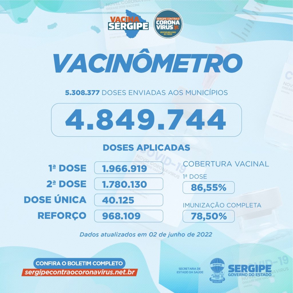 Foram enviadas aos municípios 5.308.377 doses. Destas, 1.966.919 foram aplicadas como primeira dose; 1.780.130 como segunda dose; 40.125 como dose única e 968.109 como dose de reforço. A cobertura vacinal de primeira dose está em 86,55% e 78,50% estão com a imunização completa.